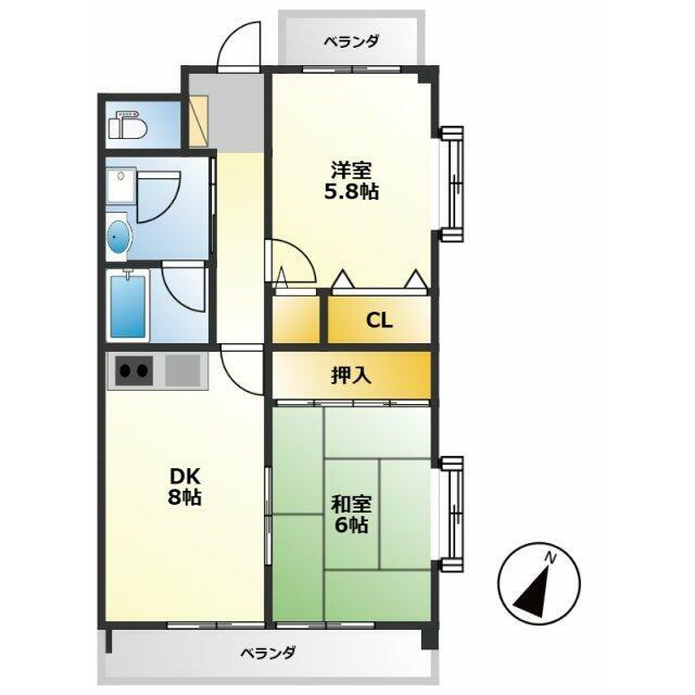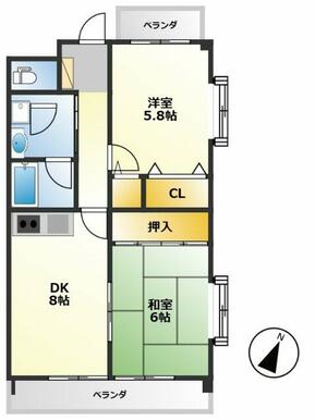 | 間取り | 2DK(DK8、和6、洋5.8) | 主要採光面 | 南東 |